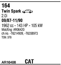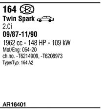 начиная с г. вып. - 09/1987; до номера шасси - T6214909; код двигателя - AR06420; Число дверей - 4; тип модели - Twin Spark