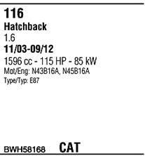 С регулируемым катализатором (3-х ступенчатый); начиная с г. вып. - 08/2004; до года вып. - 02/2007; Число дверей - 5; код двигателя - N45B16A; тип модели - E87