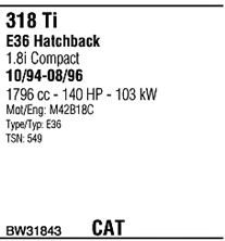 Раб. объем (округленный) - 1,8; тип модели - E36; вар. оснащения - Hatchback; раб. объем (точн.) - 1796; код двигателя - M42; Исполнение днищевой планки - Kat; мощность - 103
