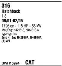 Раб. объем (округленный) - 1,8; тип модели - N42; вар. оснащения - Hatchback; начиная с г. вып. - 09/2001; раб. объем (точн.) - 1796; код двигателя - AT; Исполнение днищевой планки - Kat; мощность - 85