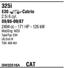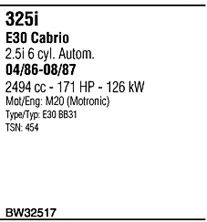 Раб. объем (округленный) - 2,5; вар. оснащения - Cabrio; раб. объем (точн.) - 2494; тип модели - E30; мощность - 126