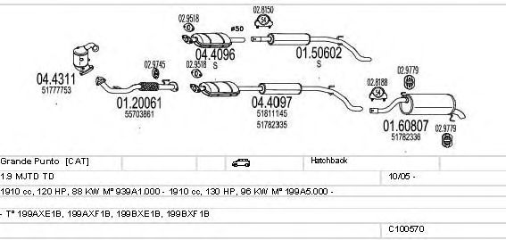 Раб. объем (округленный) - 1,9; тип модели - 199BXF1B; вар. оснащения - Hatchback; раб. объем (точн.) - 1910; код двигателя - 199A5.000; Исполнение днищевой планки - Kat; мощность - 96