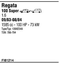 Раб. объем (округленный) - 1,6; тип модели - 138R; вар. оснащения - Sedan Stationwagon; начиная с г. вып. - 09/1984; до года вып. - 06/1986; раб. объем (точн.) - 1585; мощность - 74