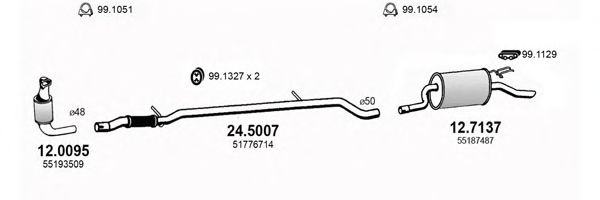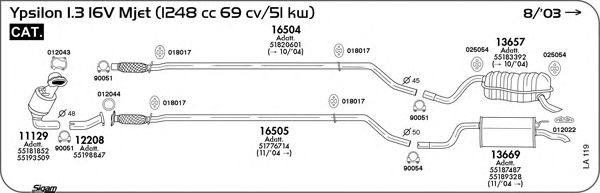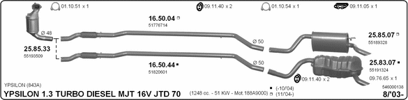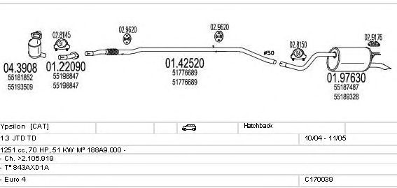 Раб. объем (округленный) - 1,3; тип модели - 843AXD1A; вар. оснащения - Hatchback; начиная с г. вып. - 10/2004; до года вып. - 11/2005; раб. объем (точн.) - 1251; код двигателя - 188A9.000; с № шасси - >2.105.919; Исполнение днищевой планки - Kat; мощность - 51