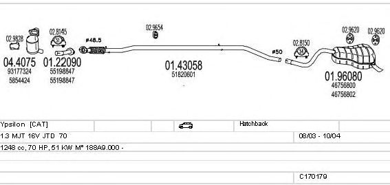 Раб. объем (округленный) - 1,3; тип модели - MJT 16V JTD 70; вар. оснащения - Hatchback; Число дверей - A; до года вып. - 10/2004; раб. объем (точн.) - 1248; код двигателя - 188A9.000; Исполнение днищевой планки - Kat; мощность - 51