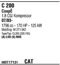 Раб. объем (округленный) - 1,8; тип модели - CL203; вар. оснащения - Coupé; начиная с г. вып. - 07/2003; раб. объем (точн.) - 1796; код двигателя - 271.942; Исполнение днищевой планки - Kat; мощность - 125
