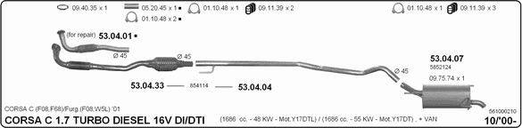 Раб. объем (округленный) - 1,7; тип модели - Di Combo TD; начиная с г. вып. - 10/2001; до года вып. - 07/2004; раб. объем (точн.) - 1686; код двигателя - Y1.7DTL; Исполнение днищевой планки - Kat; мощность - 48