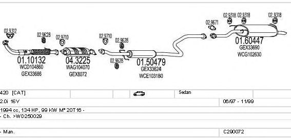 Раб. объем (округленный) - 2; тип модели - i 16V; вар. оснащения - Sedan; Число дверей - A; начиная с г. вып. - 06/1997; до года вып. - 11/1999; раб. объем (точн.) - 1994; код двигателя - 20T16; с № шасси - >WD250029; Исполнение днищевой планки - Kat; мощность - 99
