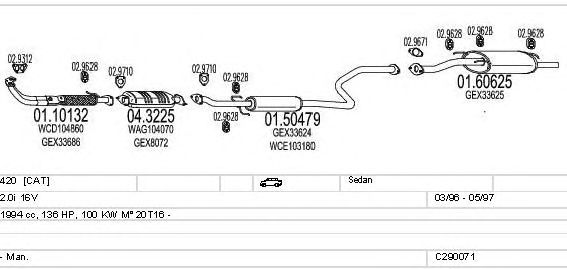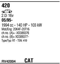 Раб. объем (округленный) - 2; тип модели - i 16V; вар. оснащения - Sedan; начиная с г. вып. - 03/1996; до года вып. - 05/1997; раб. объем (точн.) - 1994; код двигателя - 20T16; Исполнение днищевой планки - Kat; мощность - 100