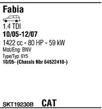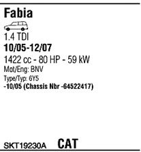 Раб. объем (округленный) - 1,4; тип модели - TDi TD; вар. оснащения - Stationwagon; начиная с г. вып. - 11/2005; раб. объем (точн.) - 1422; код двигателя - BNV; с № шасси - >6Y-64522418; Исполнение днищевой планки - Kat; мощность - 59