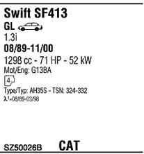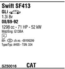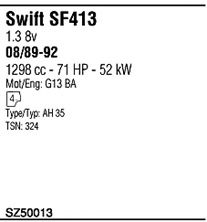 Раб. объем (округленный) - 1,3; тип модели - SF413; вар. оснащения - Sedan; Число дверей - AA; раб. объем (точн.) - 1298; код двигателя - G13BA; Исполнение днищевой планки - Kat; мощность - 50