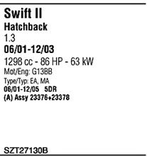 Раб. объем (округленный) - 1,3; тип модели - SF413; вар. оснащения - Hatchback; Число дверей - A5; раб. объем (точн.) - 1298; код двигателя - G13BB; Исполнение днищевой планки - Kat; мощность - 63