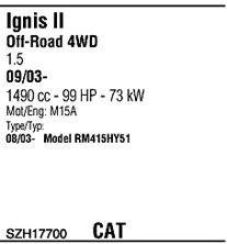 Раб. объем (округленный) - 1,5; тип модели - RM415; начиная с г. вып. - 10/2003; раб. объем (точн.) - 1490; код двигателя - M15A; Исполнение днищевой планки - Kat; мощность - 80