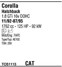 Раб. объем (округленный) - 1,6; тип модели - AE102; вар. оснащения - Hatchback; Число дверей - A; раб. объем (точн.) - 1762; код двигателя - 7A-FE; Исполнение днищевой планки - Kat; мощность - 92