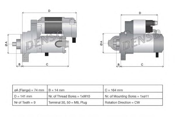 Напряжение [В]: 12 Мощность стартера [кВт]: 1 Число зубцов: 9 Количество крепежных отверстий: 2 Количество резьбовых отверстий: 1 ? фланца [мм]: 74 Длина 1 [мм]: 165 Длина 2 [мм]: 13 Клемма: M8 Идентификационный номер исполнения штекерного разъема: Plug Направление вращения: По часовой стрелке Длина 3 [мм]: 22