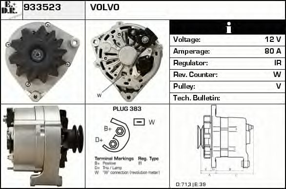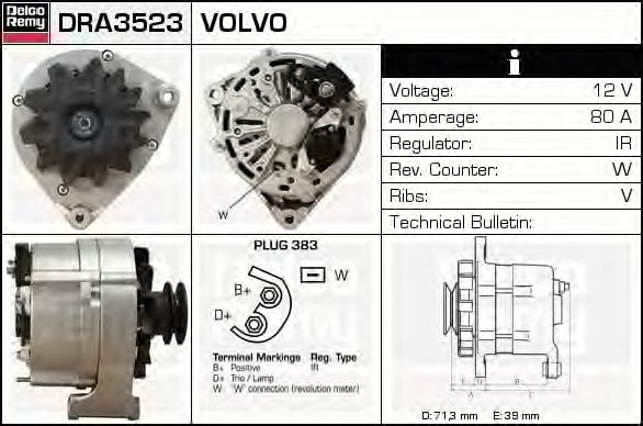 Напряжение [В]: 12 Сила тока [A]: 80 Направление вращения: По часовой стрелке Ременной шкив: Со ремённым шкивом Соединение/клемма: С подключением к тахометру