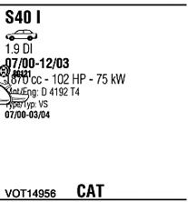 Раб. объем (округленный) - 1,9; тип модели - TD; вар. оснащения - Sedan; начиная с г. вып. - 01/2001; раб. объем (точн.) - 1870; код двигателя - D4192T4; Исполнение днищевой планки - Kat; мощность - 75