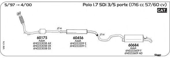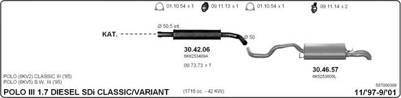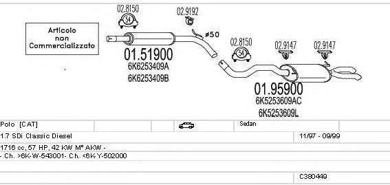 Раб. объем (округленный) - 1,7; тип модели - SDi Classic Die; вар. оснащения - Sedan; начиная с г. вып. - 11/1997; до года вып. - 09/1999; раб. объем (точн.) - 1716; код двигателя - AKW; с № шасси - >6K-W-543001; до номера шасси - <6K-Y-502000; Исполнение днищевой планки - Kat; мощность - 42