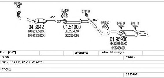 Раб. объем (округленный) - 1,9; тип модели - 6V2; вар. оснащения - Sedan Stationwagon; Число дверей - B; начиная с г. вып. - 05/1996; раб. объем (точн.) - 1896; код двигателя - AEY; Исполнение днищевой планки - Kat; мощность - 47