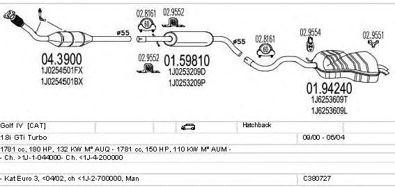 Раб. объем (округленный) - 1,8; тип модели - i GTi Turbo; вар. оснащения - Hatchback; до года вып. - 06/2004; раб. объем (точн.) - 1781; код двигателя - AUQ; с № шасси - >1J-1-044000; до номера шасси - <1J-4-200000; Исполнение днищевой планки - Kat; мощность - 132