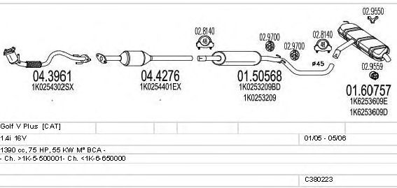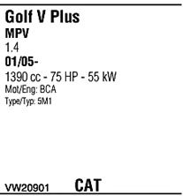 Раб. объем (округленный) - 1,4; тип модели - i 16V; до года вып. - 05/2006; раб. объем (точн.) - 1390; код двигателя - BCA; с № шасси - >1K-5-500001; до номера шасси - <1K-6-650000; Исполнение днищевой планки - Kat; мощность - 55