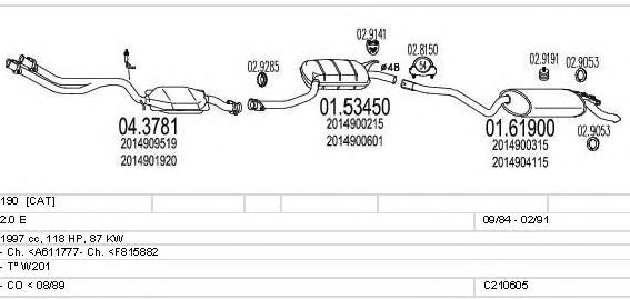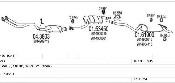 Раб. объем (округленный) - 2; тип модели - W201; Число дверей - C; начиная с г. вып. - 08/1985; до года вып. - 08/1988; раб. объем (точн.) - 1996; код двигателя - 102962; Исполнение днищевой планки - Kat; мощность - 87