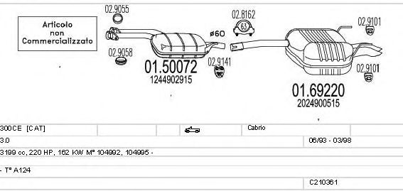 Раб. объем (округленный) - 3; вар. оснащения - Cabrio; Число дверей - A; начиная с г. вып. - 06/1993; раб. объем (точн.) - 3199; код двигателя - 104995; тип модели - A124; Исполнение днищевой планки - Kat; мощность - 162