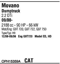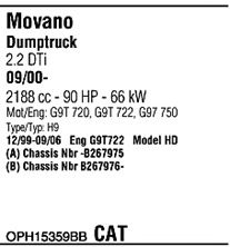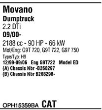 Раб. объем (округленный) - 2,2; тип модели - Dti, CDTi TD; до года вып. - 11/2003; раб. объем (точн.) - 2188; код двигателя - G9T722; Исполнение днищевой планки - Kat; мощность - 66