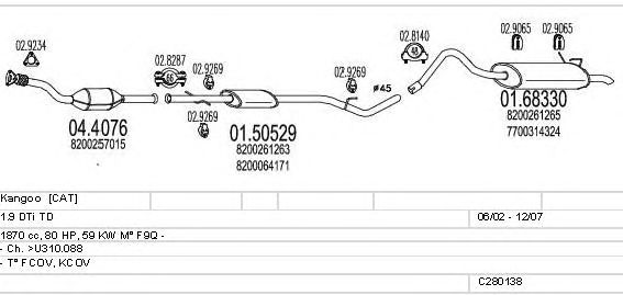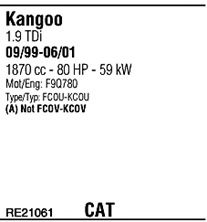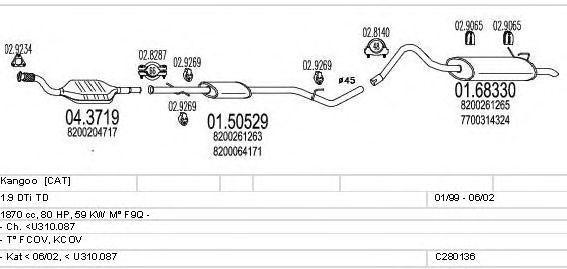 Раб. объем (округленный) - 1,9; тип модели - KCOV; Число дверей - BB; начиная с г. вып. - 06/2002; до года вып. - 12/2007; раб. объем (точн.) - 1870; код двигателя - F9Q; с № шасси - >U310.088; Исполнение днищевой планки - Kat; мощность - 59