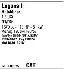 Раб. объем (округленный) - 1,9; тип модели - KG4AB6; вар. оснащения - Hatchback Stationwag; Число дверей - AABB; начиная с г. вып. - 03/2005; до года вып. - 12/2007; раб. объем (точн.) - 1870; код двигателя - F9Q758; Исполнение днищевой планки - Kat; мощность - 81