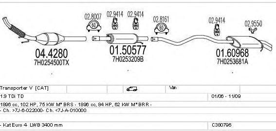 Раб. объем (округленный) - 1,9; тип модели - TDi TD; вар. оснащения - Van; Число дверей - EEEEE; раб. объем (точн.) - 1896; код двигателя - BRS; с № шасси - >7J-6-022000; до номера шасси - <7J-A-010000; Исполнение днищевой планки - Kat; мощность - 75